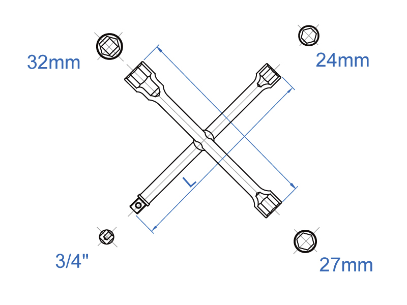 - Баллонный колесный крестообразный ключ имеет три головки разных размеров и один присоединительный квадрат 3/4" (для возможности установки любой необходимой головки) для откручивания и закручивания разнообразных болтов при снятии/установке автомобильных колес.