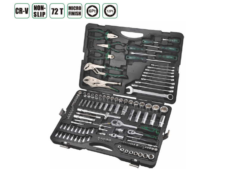 - Инструмент в комплекте трещотка, вороток для головок, рукоять для бит, отвертки, ключи гаечные, пассатижи, захват переставной, шестигранники