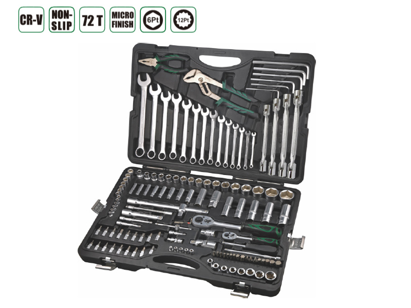 - Инструмент в комплекте трещотка, вороток для головок, рукоять для бит, ключи гаечные, захват переставной, шестигранники