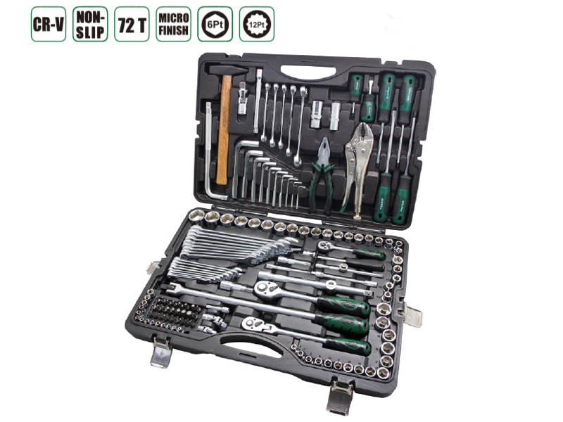 - Инструмент в комплекте трещотка, вороток для головок, рукоять для бит, отвертки, ключи гаечные, пассатижи, молоток, захват переставной, шестигранники