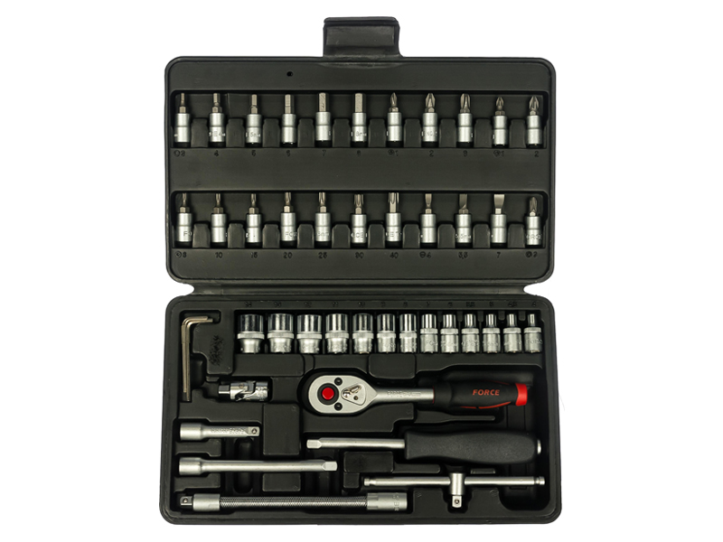 - Инструмент в комплекте трещотка, вороток для головок, рукоять для бит, шестигранники