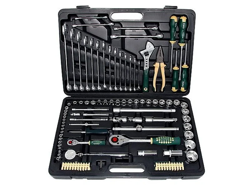 - Инструмент в комплекте трещотка, вороток для головок, рукоять для бит, отвертки, ключи гаечные, пассатижи, разводной ключ