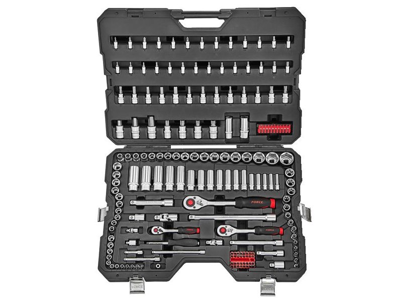 Force 180 предметов является универсальным, а кроме того укомплектован грамотно подобранным ассортиментом насадок, головок и других устройств. Подобные инструменты возможно использовать для ремонта, либо сборки разного машиностроительного оборудования. Увеличенная прочность дает возможность работать в самых экстремальных условия благодаря специальной хромованадиевой стали.