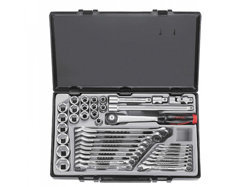 - Профессиональный набор торцевых головок и комбинированных ключей.