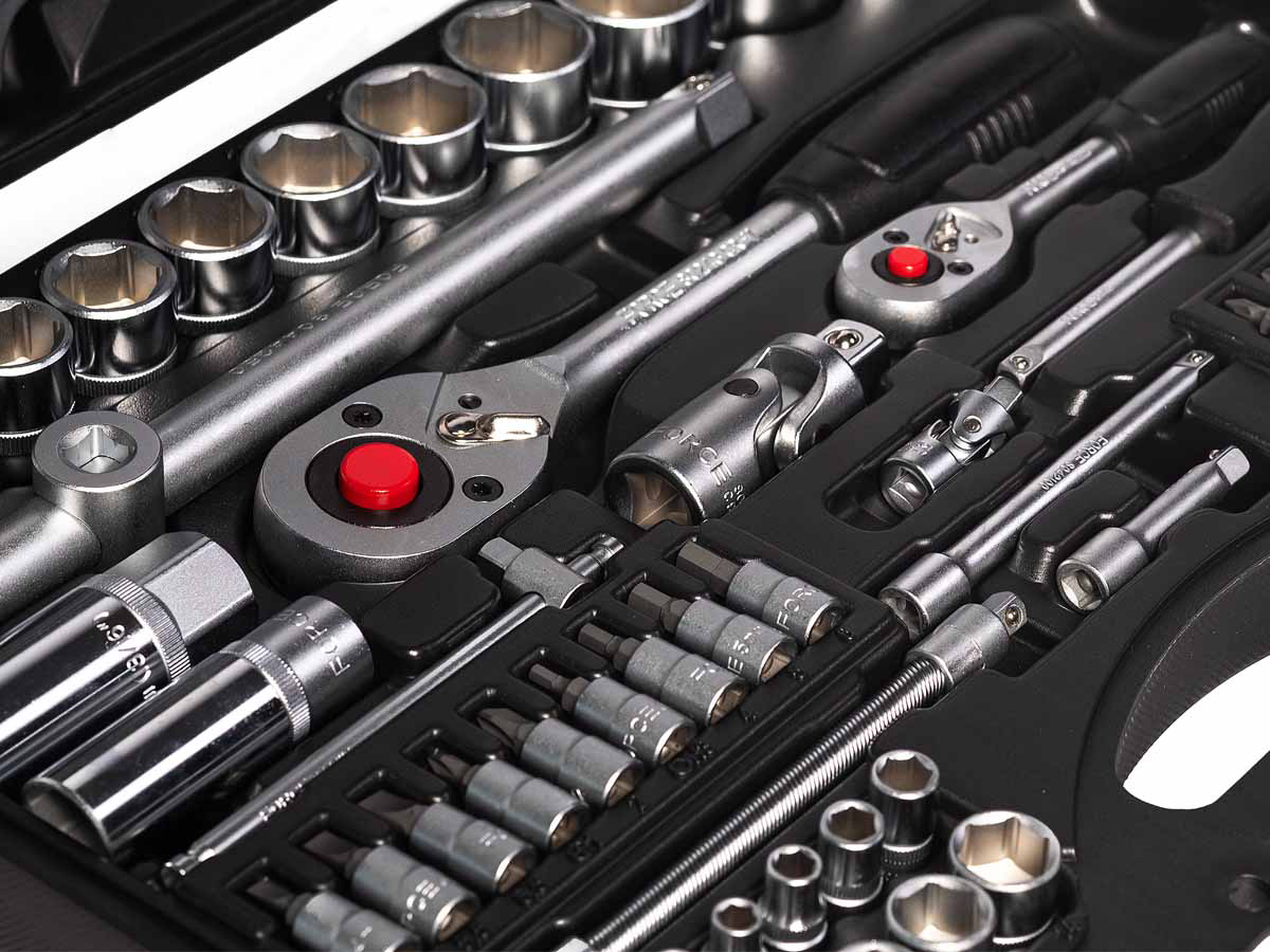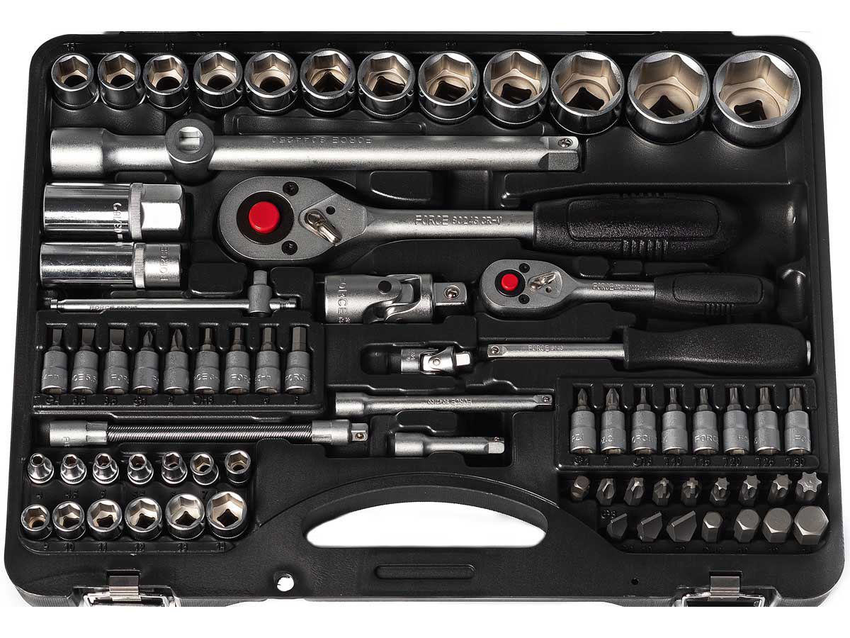 - Инструмент в комплекте трещотка, вороток для головок, рукоять для бит, ключи гаечные