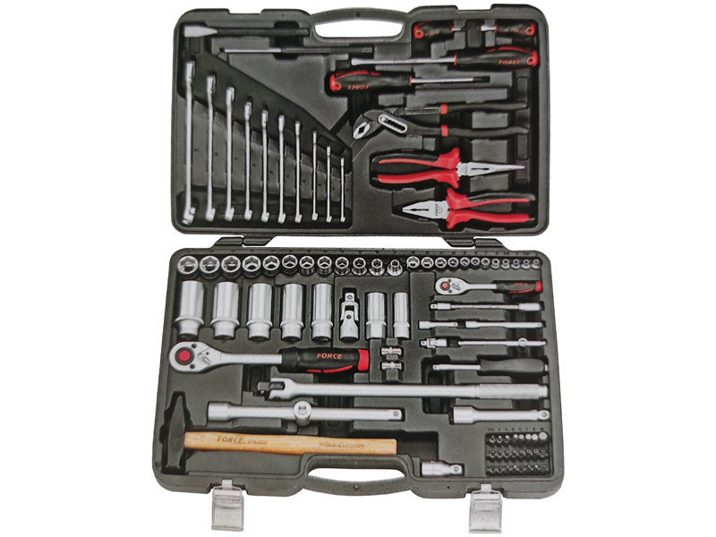 - Инструмент в комплекте трещотка, вороток для головок, рукоять для бит, отвертки, ключи гаечные, пассатижи, молоток, захват переставной, зубило
