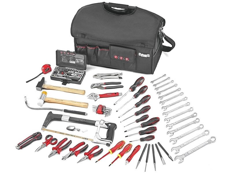 - Инструмент в комплекте трещотка, рукоять для бит, отвертки, ключи гаечные, пассатижи, молоток, захват переставной, шестигранники, клещи переставные, разводной ключ