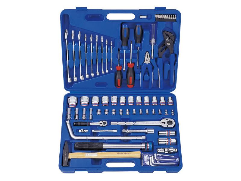 - Инструмент в комплекте трещотка, вороток для головок, рукоять для бит, отвертки, ключи гаечные, пассатижи, молоток, захват переставной, шестигранники