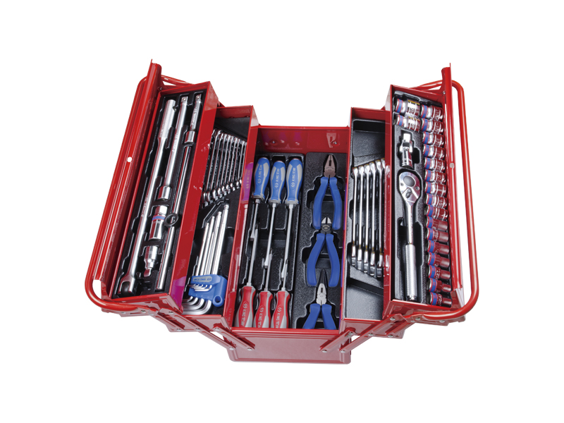 - Инструмент в комплекте трещотка, вороток для головок, отвертки, ключи гаечные, пассатижи, шестигранники, бокорезы