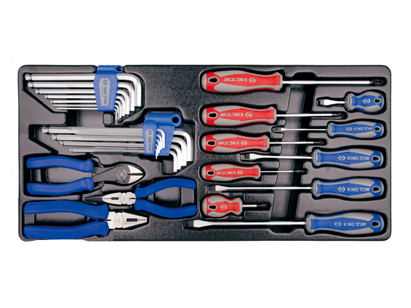 KING TONY 9-90129CR - набор отверток, Г-образных шестигранников, плоскогубцев и бокорезы. Набор размещен в ложементе и включает в себя отвертки шлицевые и крестовые разной длины и профиля, комплект угловых шестигранников метрического и дюймового стандарта. Ложемент позволяет хранить все предметы в строгом порядке.