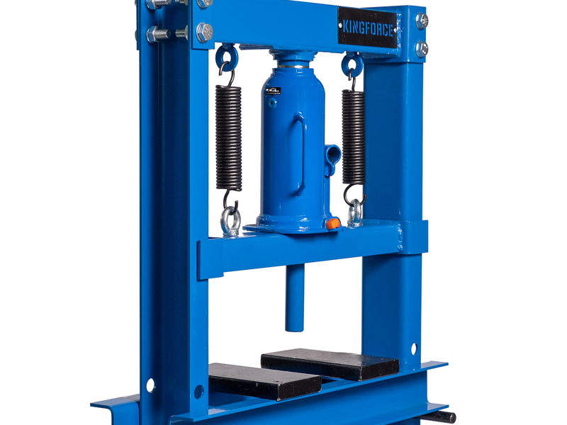 Гидравлический пресс KINGFORCE представляет собой разборную конструкцию из стоек, станин, верхней и нижней балок и привода, основным рабочим элементом которой является гидравлический домкрат бутылочного типа. Размеры деталей, которые подвергаются опрессовке, ограничиваются только размерами рабочего пространства пресса.