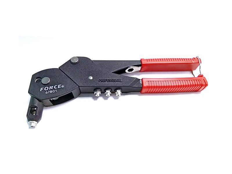 FORCE 67801 Комплект: Заклепочник L= 180мм. с поворотной головкой на 360°, с 4-мя насадками. Используется для скрепления различных материалов между собой с помощью вытяжных заклёпок. Благодаря поворотной головке Заклёпочник удобен в эксплуатации. Поворотная головка обеспечивает быстрое приспособление к конкретной ситуации. Надежная фиксация запасных насадок на рукоятке заклёпочника делает заклёпочник универсальным.