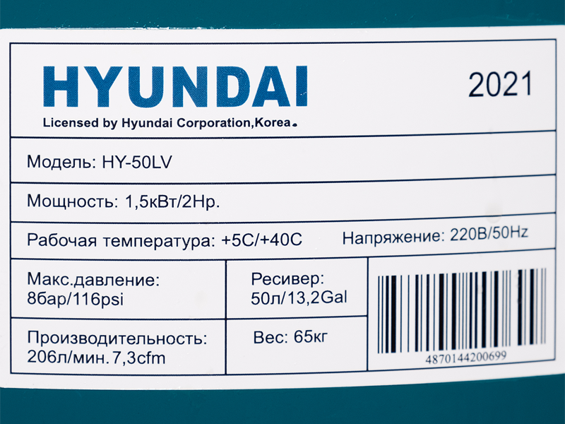 - Компрессор HYUNDAI HY-50LV с производительностью в 206 л/мин.