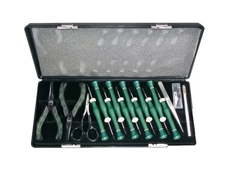 Набор интсрументов для ювелирных работ (16pc Jeweler screwdriver set). В комплект входят отвёртки с прямым шлицем (SLOTTED; 6 шт.), крестовые отвертки (PHILLIPS; 2 шт.), отвёртки с шестигранным шлицем (HEX; 3 шт.), а также кусачки, длинногубцы, ножницы, пинцет и скальпель со сменными лезвиями (6 шт.). Все отвертки для точных ювелирных работ, удлинённые, со свободно вращающейся задней частью рукоятки.