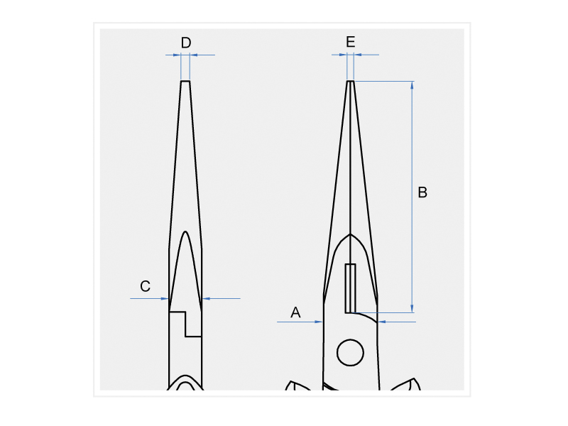 - толщина X ширина окончания губок в сомкнутом положении, D x E – 1,5 x 1,7 мм.