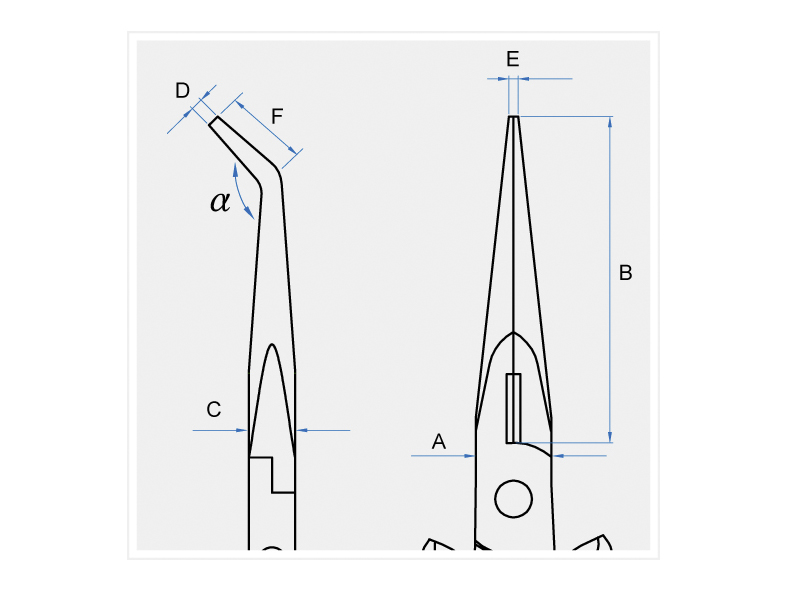 - толщина X ширина окончания губок в сомкнутом положении, D x E – 2 x 2,5 мм.