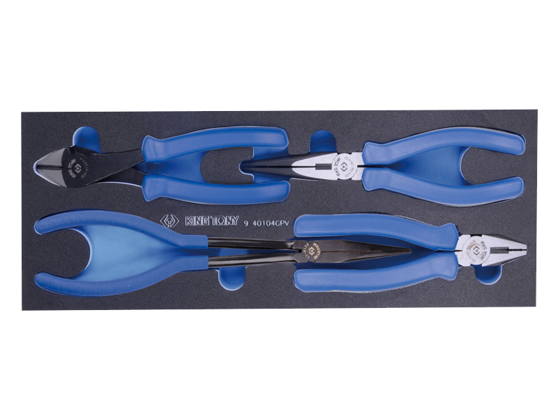 Набор инструментов 4 предмета пассатижи, бокорезы и утконосы King Tony 9-40104GPV в ложементе из материала EVA предназначен для комплектации передвижных инструментальных тележек или слесарных верстаков при создании индивидуальных рабочих мест на станциях технического обслуживания автомобилей (СТОА) и других предприятиях, занимающихся обслуживанием и ремонтом различной техники.