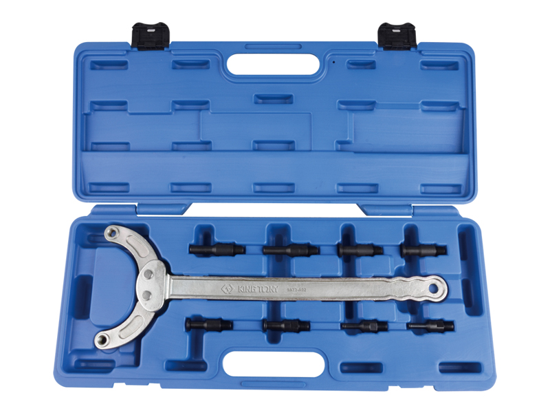 Универсального ключа для снятия зубчатых шкивов распределительных валов, диапазон: 40-140 мм, включает в себя четыре пары сменных шпинделей в размерах 7, 10, 14, 16 мм, разводной рычажный ключ , чтобы зафиксировать шкивы.