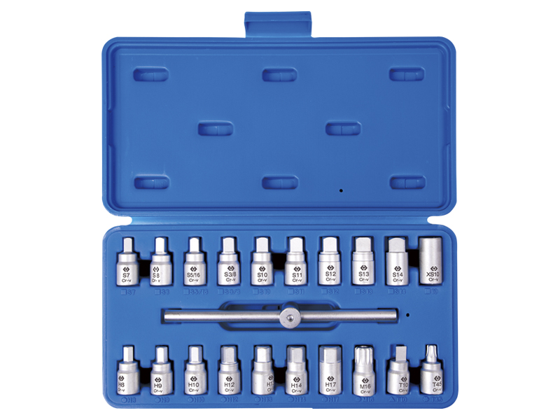 В состав набора входит 20 насадок различного профиля и размеров и вороток Т-образного профиля. Хромированное покрытие защищает инструменты от коррозии.