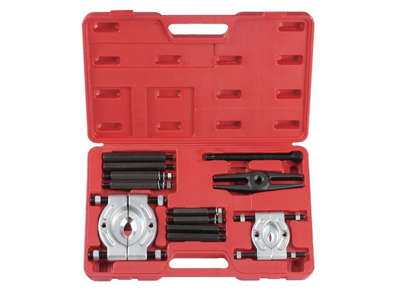 - Съемник включает в себя два вида сегментных съёмников с разным диапазоном размеров, удлиняющие штанги, поперечную балку и центральный силовой болт.