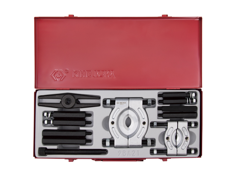 - Съемник включает в себя два вида сегментных съёмников с разным диапазоном размеров, удлиняющие штанги, поперечную балку и центральный силовой болт.