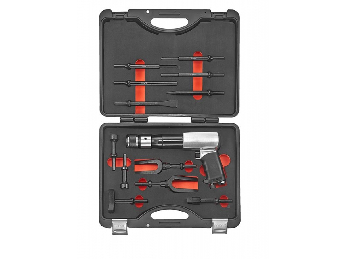 Очень обширный набор с пневматическим отбойным молотком от Force. Поставляется в кейсе для хранения с различными долотами.