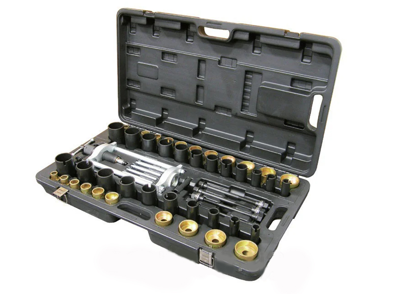 Набор оправок для установки втулок рулевой сошки и сайлентблоков с ручным приводом, позволяет разобрать и заменить поврежденные втулки. Комплект состоит из 50 предметов. 4 шпинделя специально разработаны для маленьких втулок.