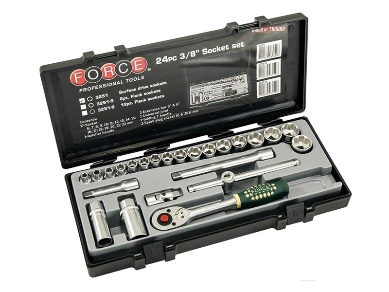 - Головки торцевые 3/8"(17 шт): 6; 7; 8; 9; 10; 11; 12; 13; 14; 15; 16; 17; 18; 19; 20; 21; 22 мм;