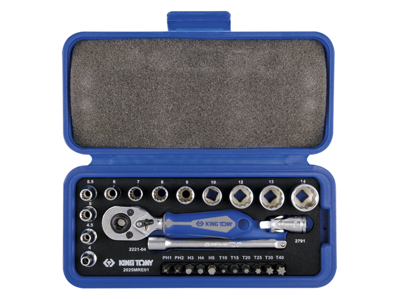 - 12 торцевых стандартных головок 1/4": 4, 4.5, 5, 5.5, 6, 7, 8, 9, 10, 12, 13, 14 мм;