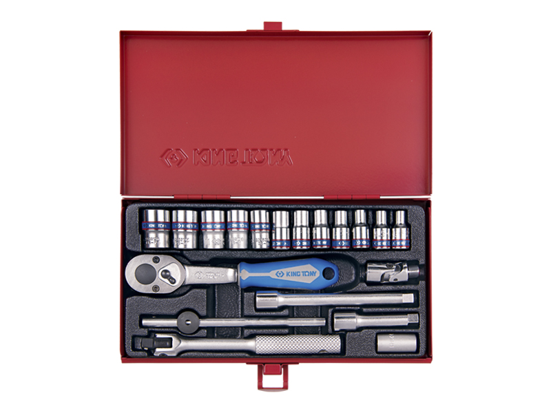 - Набор с инструментом торговой марки KING TONY включает в себя торцевые головки, насадки формата 1/4" и принадлежности к ним.