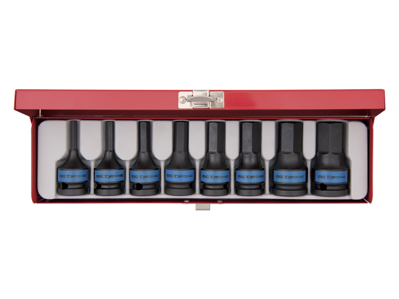 Набор ударных торцевых насадок 1/2", HEX, 5-19 мм, 8 предметов KING TONY 4418MP включает в себя ударные шестигранные вставки и принадлежности, предназначенные для работы пневматическим инструментом. Входящий в материал инструментов хром-молибденовый сплав придаёт особую прочность и стойкость к ударным нагрузкам.