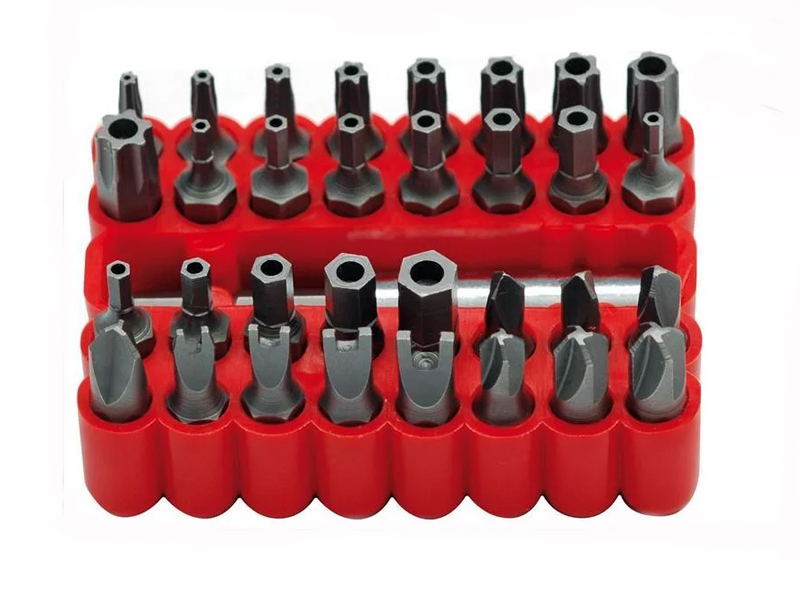 - Биты Torx с отверстием L = 25 мм (9 шт): T8H; T10H; T15H; T20H; Т25H; T27H; T30H; T35H; T40H